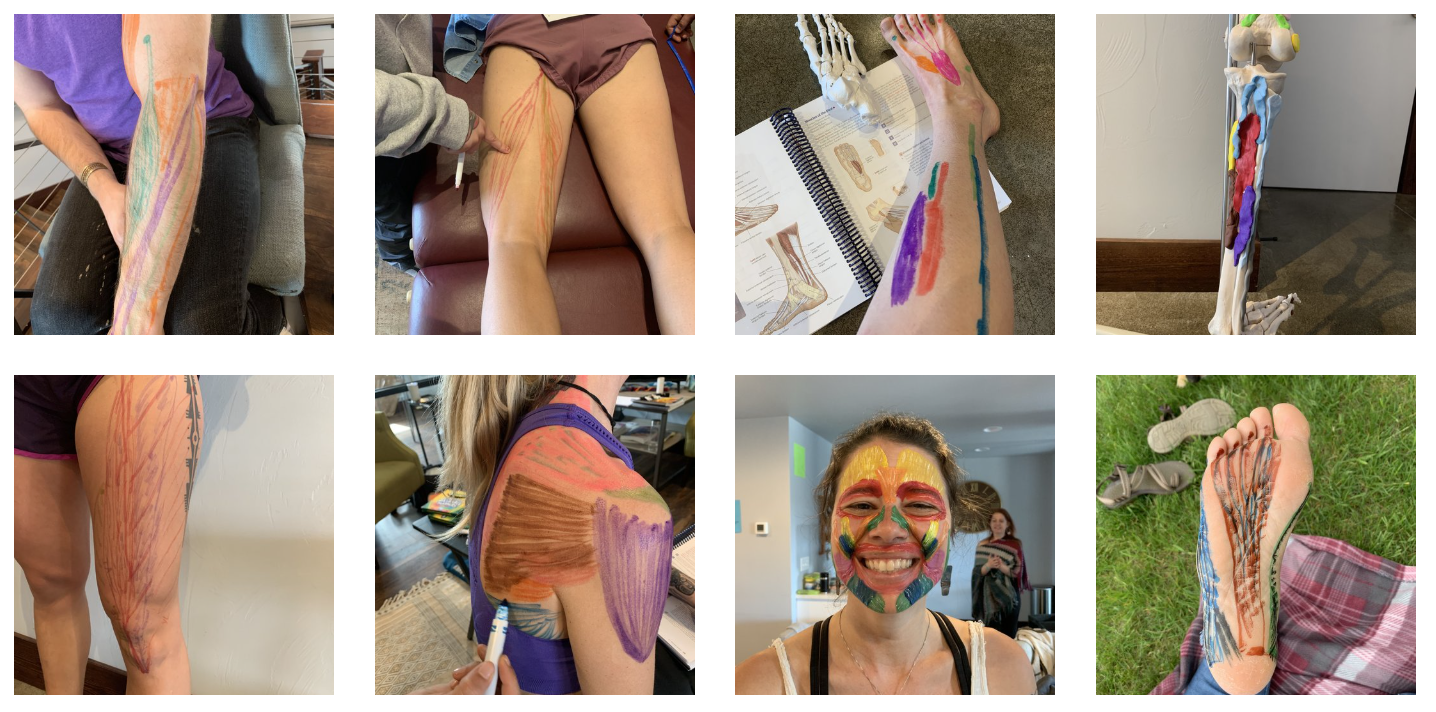 Palpating, exploring and coloring on the body, bringing the muscles to the surface and more accurately seeing how they move.